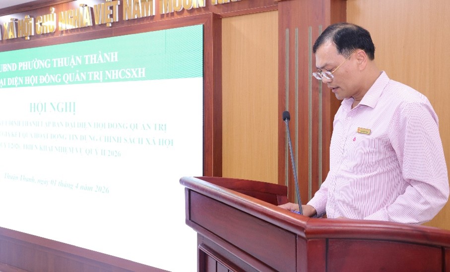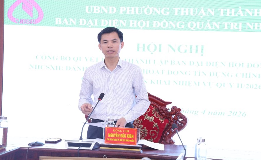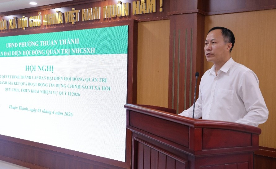 Chiều 1/4/2026, UBND phường Thuận Thành tổ chức Hội nghị công bố Quyết định thành lập Ban đại diện Hội đồng quản trị Ngân hàng Chính sách xã hội (NHCSXH) phường; ra mắt Ban đại diện; đồng thời đánh giá kết quả hoạt động tín dụng chính sách xã hội Quý I/2026 và triển khai nhiệm vụ Quý II/2026.