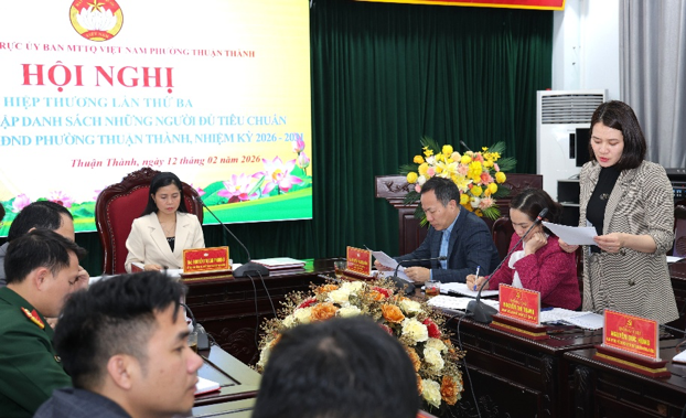 Chiều ngày 12/2, Ủy ban MTTQ Việt Nam phường Thuận Thành tổ chức Hội nghị hiệp thương lần thứ ba để lựa chọn, lập danh sách những người đủ tiêu chuẩn ứng cử đại biểu Hội đồng nhân dân phường, nhiệm kỳ 2026 - 2031.