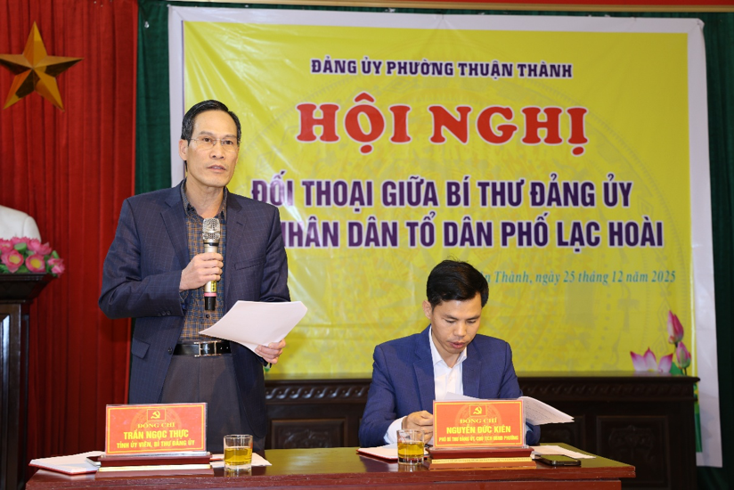 Chiều ngày 25/12/2025, tại Nhà văn hóa tổ dân phố Lạc Hoài, Đảng ủy phường Thuận Thành tổ chức Hội nghị gặp gỡ, tiếp xúc, đối thoại trực tiếp giữa Bí thư Đảng ủy với cán bộ, đảng viên và Nhân dân tổ dân phố Lạc Hoài